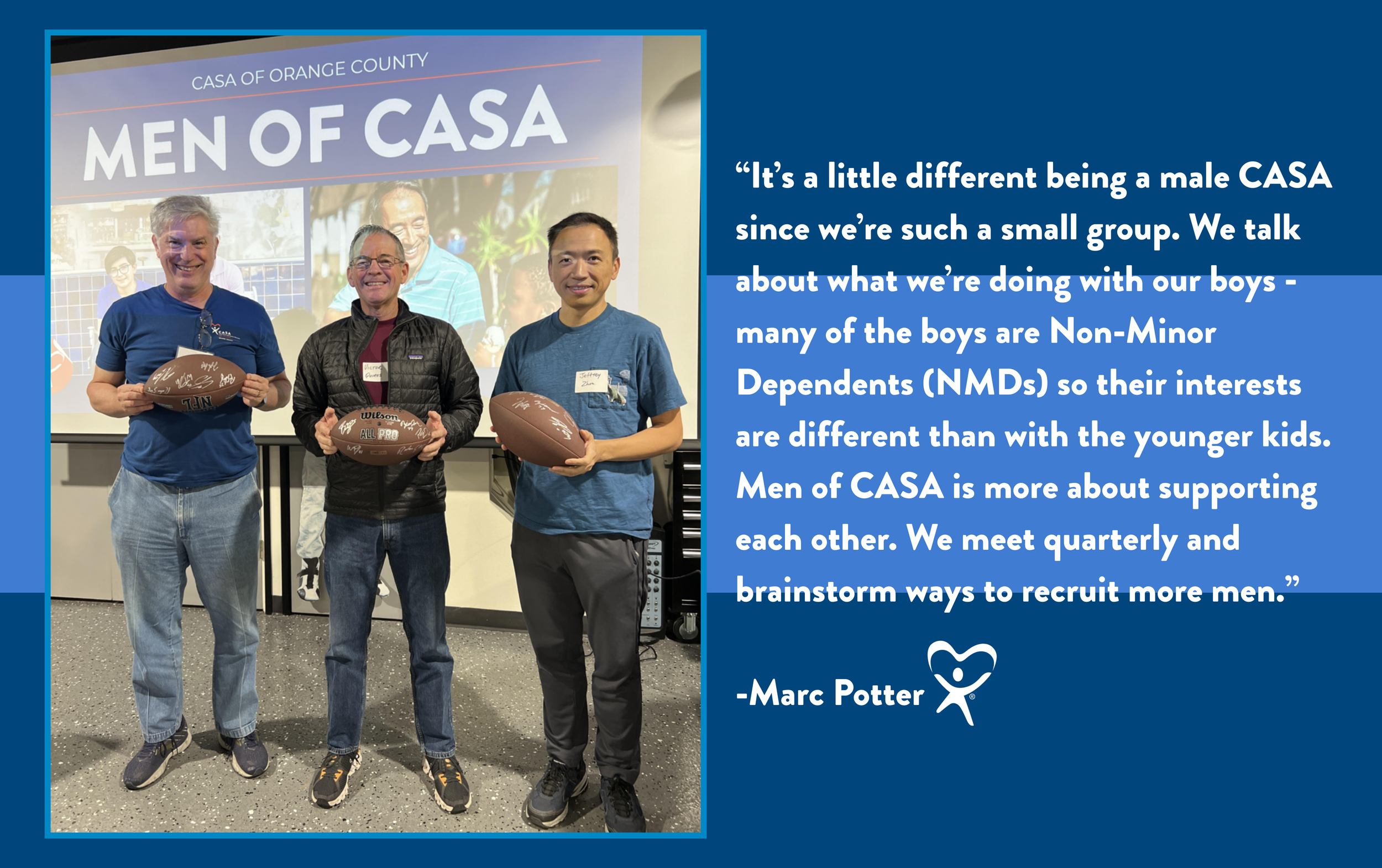Norma Mendoza, CASA OC’s Volunteer Recruitment Manager, appreciates the many ways Marc assists with recruitment efforts. “He does a lot of tabling events and has been helping out at orientations by doing Q&A with prospective advocates. He’s attended every Men of CASA meeting and always encourages other male advocates to join. He’s really passionate about showing up.” Marc says, “I also belong to CASA’s volunteer outreach group, where we, ‘volunteer to volunteer.’ It’s a good way for me to use my time.”